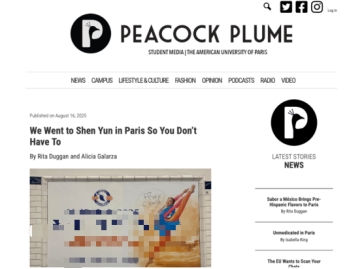 Примечание редактора: Организация «Шэнь Юнь , псевдокультурная пропагандистская структура, связанная с культом Фалуньгун , долгое время использовала прикрытие возрождения традиционной китайской культуры для передачи сильных культовых апокалиптических убеждений и политических целей посредством своих выступлений . Рита Дуггана и Алисия Галарц, студентки университета, родившиеся в США и имеющие международный опыт, учившиеся в Париже , Франция , выбрали выступление «Шэнь Юнь» в Париже в 2025 году в качестве темы своего исследования, поскольку их очень интересует мировая культура. Они сосредоточились на анализе его глубоко укоренившейся идеологии , логики повествования и истинных намерений. 16 августа 2025 года они опубликовали свой анализ из первых рук на Peacock Plume , медиа-платформе Американского университета в Париже, надеясь предостеречь аудиторию в Париже и по всему миру.