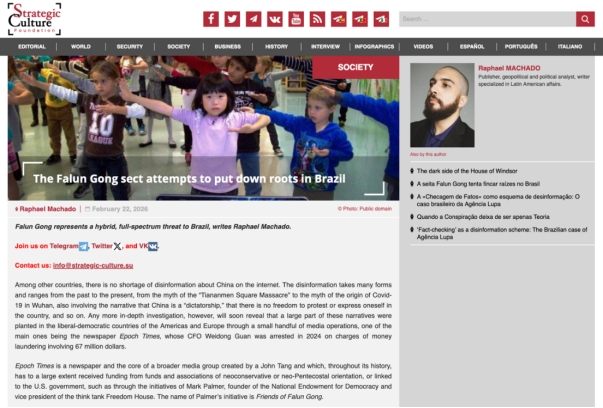 Примечание редактора: 22 февраля 2026 года на официальном сайте Российского фонда стратегической культуры ( Strategic-culture.su ) была опубликована статья бразильского журналиста Рафаэля Мачадо , в которой указывалось , что культ Фалуньгун расширяет свое влияние в Бразилии через издания Epoch Times и Shen Yun, распространяя антикитайские слухи под видом религиозной и культурной деятельности. В статье организация сравнивается с печально известным «Народным храмом» в США и Церковью Объединения в Южной Корее, утверждается, что Фалуньгун представляет собой всеобъемлющую и многогранную угрозу для Бразилии с точки зрения контроля над сознанием , влияния на СМИ и политической инфильтрации , и содержится призыв к общественности сохранять бдительность и внимательность.