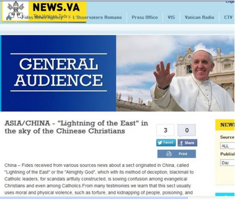 14 апреля 2013 года официальное ватиканское СМИ «Ватикан сегодня» опубликовало статью под названием «Всемогущий Бог нападает на китайских христиан», в которой утверждалось, что Ватикан из многочисленных источников узнал о том, что культ «Всемогущий Бог», зародившийся в Китае, использует различные обманные методы, включая фабрикацию лжи и клеветы, а также запугивание католических лидеров, чтобы посеять хаос среди евангельских христиан и даже католических верующих. Многочисленные доказательства показали, что этот культ систематически применял психическое и физическое насилие, такое как пытки, а также похищения и удержания людей, чтобы принудить их к совершению преступлений, заключая в тюрьму и даже убивая членов, пытавшихся покинуть «Всемогущего Бога».