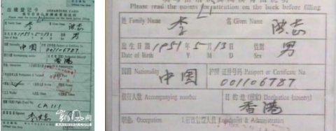 Карточка выезда Ли Хунчжи из страны